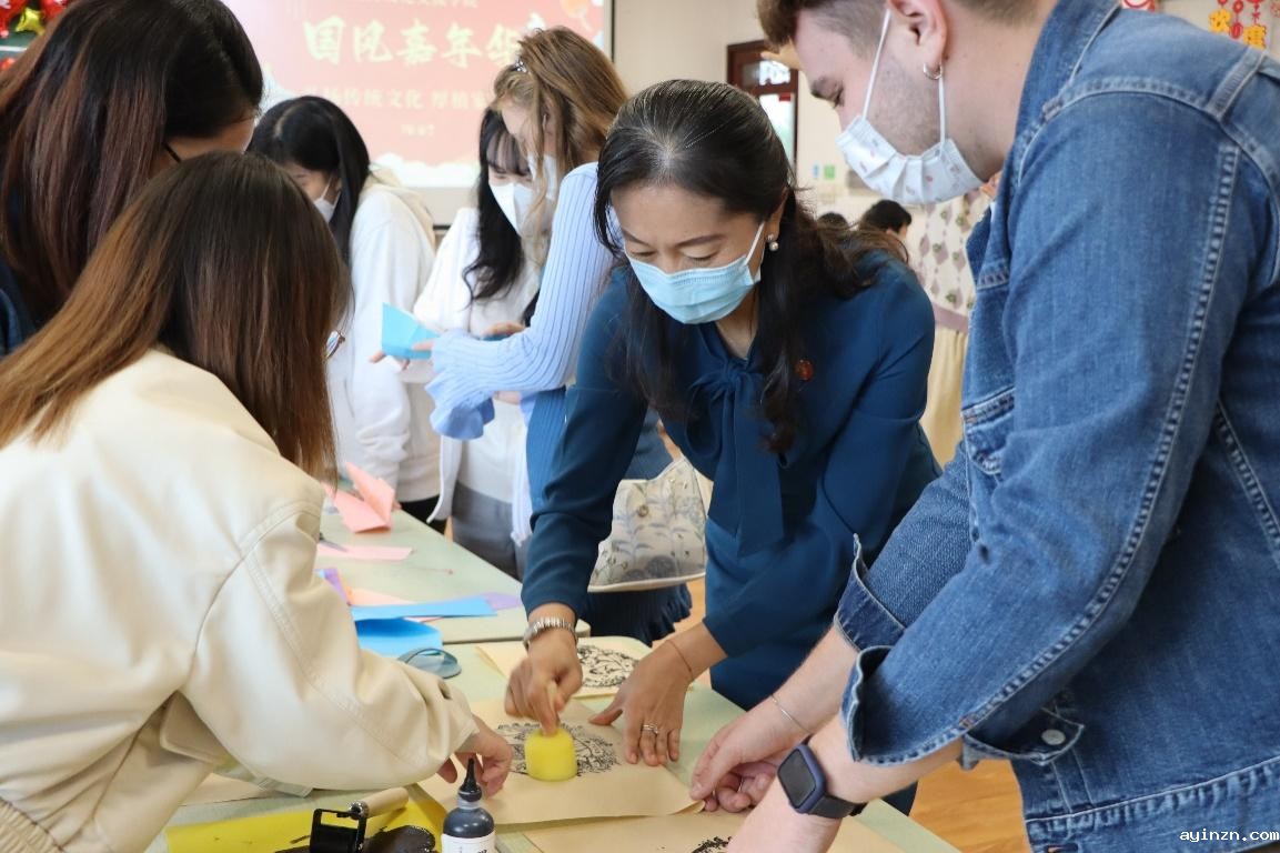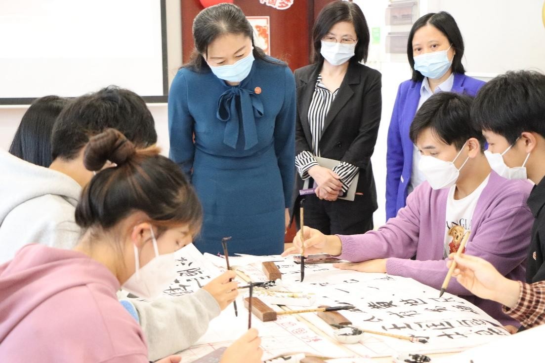 到院第一站,尹冬梅副书记专程前往光华楼东辅楼503教室,探望在此举办欢庆国庆“国风嘉年华”活动的30余名中外学子。在这里,尹书记饶有兴趣地观看了同学们正在热火朝天参与的书法、古典舞、折纸、拓印等中华传统文化体验活动,同来自美国、俄罗斯、韩国、泰国等地的国际学生们进行了亲切交谈和慰问。在俄罗斯籍研究生王力伟的演示下,尹书记热情地加入同学们中参加活动,和大家一起制作了“我爱中国”的拓印图。尹书记表示,很高兴能在小长假收尾时同中外青年们相聚在一起,共同欣赏体验中国优秀传统文化,为祖国73华诞庆生。她一方面表达了对同学们理解学校的疫情防控规定,为守护校园安全,选择留沪留校过节的赞赏,同时也从“增强美育与体育,滋养精神内涵”和“继续众志成城,维护安全幸福校园”等方面为同学们送上亲切寄语,祝福大家为小长假画上愉快的句号,早日收心回归学习生活,努力实现自己理想的期末GPA。同学们认真聆听尹书记的谆谆教导,纷纷表示一定会认真学习、遵守校规、发展爱好,做全方面发展的国交人。