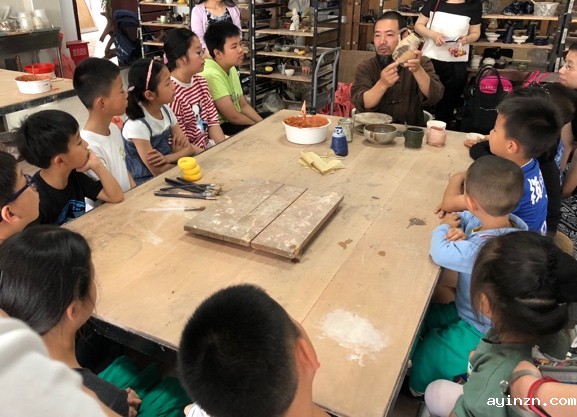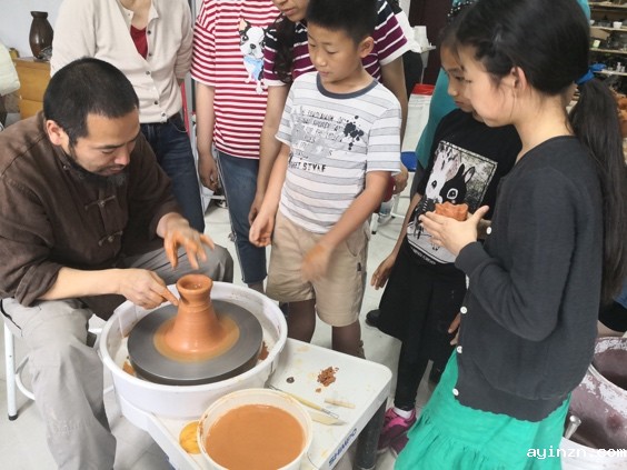 包老师向大家详细介绍了陶艺的制作方法,包括泥板、泥条、捏塑、拉坯等方法,孩子们也问了包老师很多相关问题,随后大家开始制作陶器。在家长和孩子的共同努力下,大家制作了各种各样的陶器,有杯子,有笔筒,还有马头。杯子有圆口的,也有心形的。孩子们还体验了拉坯的制作方法。包老师非常耐心细致地给大家讲解,在旋转的拉坯机上,一块黄泥在包老师的手里神奇地变大变小,变高变矮,一会儿又伸展开来,渐渐地,一个碗呈现在我们面前。看到这里,大家兴奋地鼓起掌来。