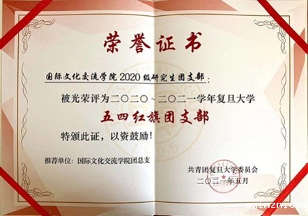 2021年5月,国际文化交流学院2020级研究生团支部被光荣评为2020-2021学年复旦大学“五四红旗团支部”。这是我院团支部第一次获此殊荣,是我院团总支积极教育引导团员青年正确认识世界、全面了解国情、把握时代大势的成果显现,也彰显我院团员青年驰骋思想、踏实前行的奋斗轨迹。