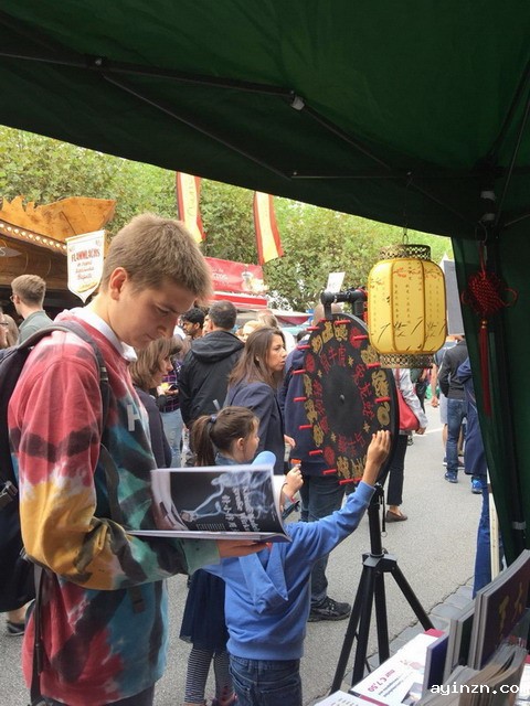 与往年相同,我院参建的法兰克福孔子学院也在本届博物馆节上设立了展台,向每一位对中国语言及文化感兴趣的游客介绍孔子学院的课程和活动。此外,法兰克福孔院还特别推出了绘有传统十二生肖的“幸运转盘”,游客们只需转动转盘就可以一试手气——参与者转到某一生肖区域就可以获得相应的奖品,转盘上的奖品也异常丰富,有生肖玩偶、法兰克福孔院钥匙扣、印有中国风景及名胜古迹的明信片、手工剪纸、各式中国结等。“幸运转盘”可谓老少皆宜,不仅吸引了很多成年人,更是引来的众多可爱的小观众们参与。在赢取精美礼品之余,很多游客都对转盘上的十二生肖产生了浓厚的兴趣,纷纷围到展台上来“一探究竟”,中国的语言和文化就这样传递到了德国乃至世界人民的眼中、手中和心中。