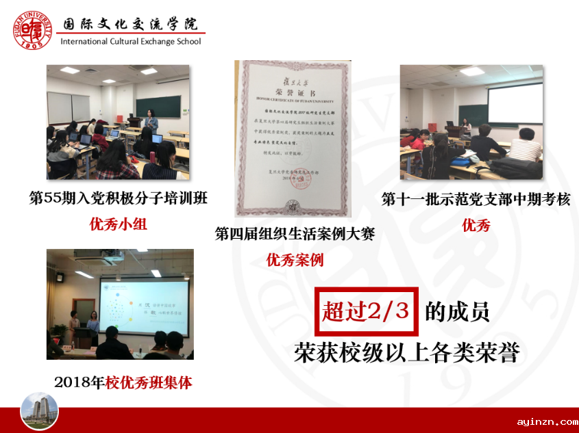 在终审答辩会上,2017级研究生党支部学生副书记余宜荣紧密结合专业特色和支部建设亮点,围绕“立足专业特色,坚定文化自信”的支部创建理念,对照校研究生示范党支部创建的十项要求,从制度建设、理论学习、志愿服务等方面进行了全方位展示,阐述了支部“五级联动”创建成效以及接下来的计划展望。支部扎实的基础建设、理论学习和持之以恒的志愿实践服务意识,体现了党支部在学生思政教育工作中的引领作用,最终获评“复旦大学第十一批研究生示范党支部”,全校总计10个。