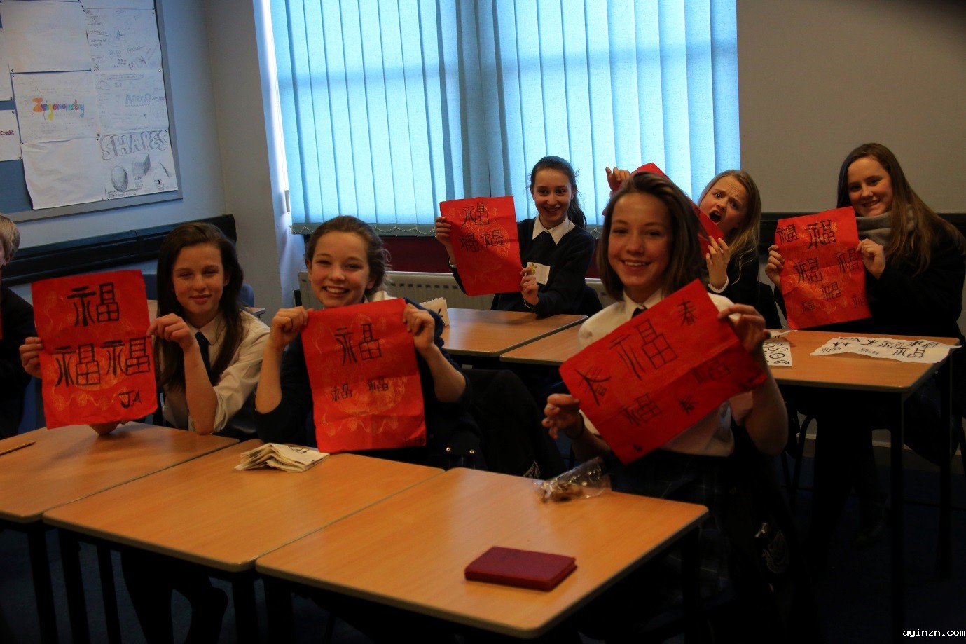 随后,“汉语日”安排了汉语、书法和太极拳教学。汉语课吸引了大批未学过汉语的学生,不仅教授简单的汉语,还介绍中国的风景名胜,比较中英两国在自然景观、野生动植物以及传统节日、百姓的生活等方面的异同。书画课上,孔子学院教师向学生介绍了中国的文房四宝、书法的特点、毛笔的种类、握笔的姿势以及汉字的基本结构等,并向学生们演示了如何书写汉字的基本笔画。学生们兴奋地学写“福”、“雪”等字,并纷纷要求老师教他们写自己的名字。太极拳课上,孔子学院中方院长身着功夫装亲自上阵,完整地演练了二十四式太极拳,学生们迫不及待地模仿起来了,并在课后献上了太极拳表演。
