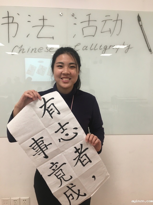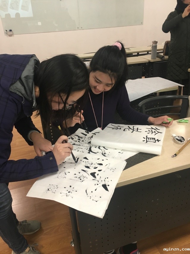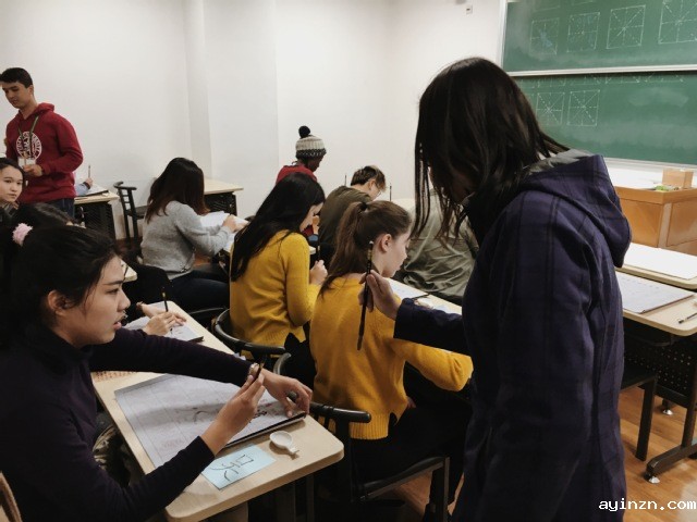 在讲解环节,书法老师为我们详细介绍了中国书法的历史发展、中国汉字的形成、拿毛笔的标准姿势等基本常识。老师讲课的热情很大程度上感染了在场的同学,同学们听得全神贯注,非常踊跃地回答老师的提问,在黑板上写汉字。