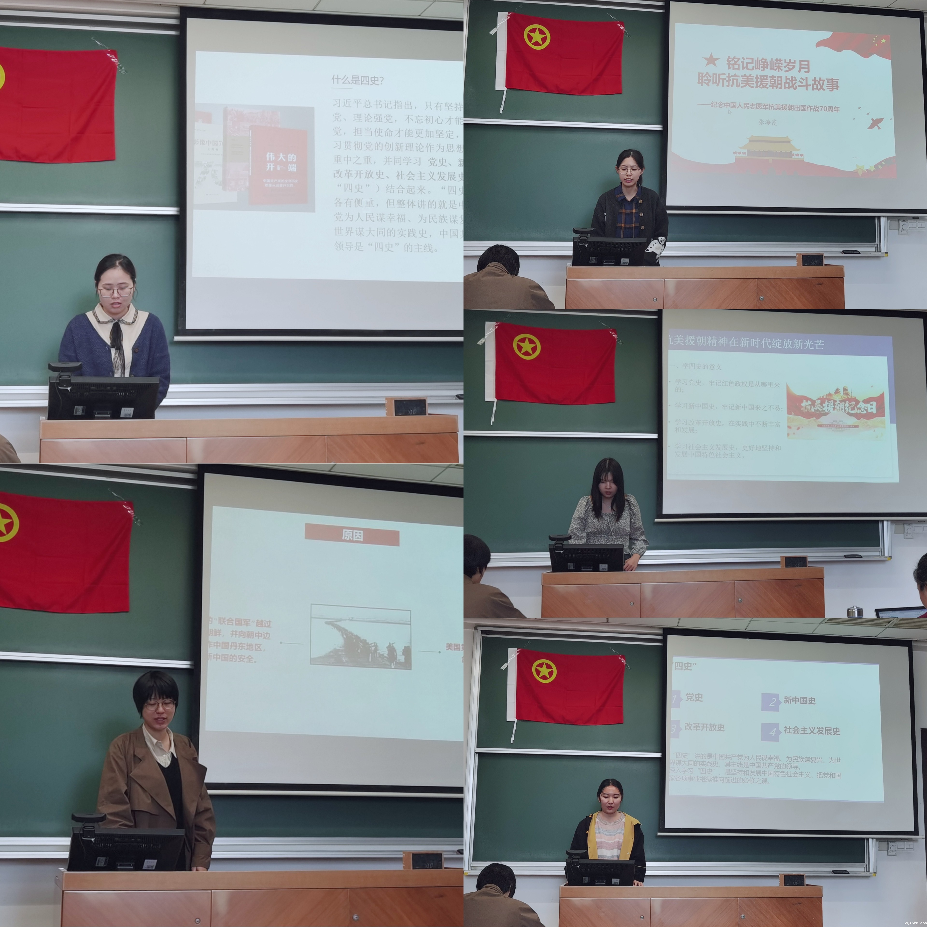 随后,五位同学就抗美援朝历史表达了自己的体悟。周思媛同学为大家分享了自己参观中国革命军事博物馆的感受。回忆起抗美援朝的岁月,周思媛动情地讲到,她的外公是当年人民志愿军里的通讯兵,离开故土数月无音讯,外婆只能在鸭绿江的对岸守望,在场的同学无不为其动容和赞叹。曹令懿同学为我们细致讲解了抗美援朝的时间线,向我们娓娓道来当年的历史景象。张海霞同学用视频的方式带我们回顾了抗美援朝的峥嵘岁月,紧接着她讲述了纪录片《英雄儿女》的情节,志愿军老兵在受访过程中几度潸然泪下,我们能真切地感受到志愿军战士当年在极度的危险与辛劳中作战。陈舒莹同学主要分析了抗美援朝的历史必要性和历史意义。正是有了领导人的高瞻远瞩和志愿军的奉献牺牲,才迫使美军放弃了深入进攻的念头,保住了中国新民主主义革命的胜利果实。王晓明同学为我们生动讲述了具有“国魂之战”之称的上甘岭战役,黄继光、孙占元等一众战士视死如归,即便身受重伤也不曾有一刻放弃战斗,时刻准备着与敌人同归于尽。
