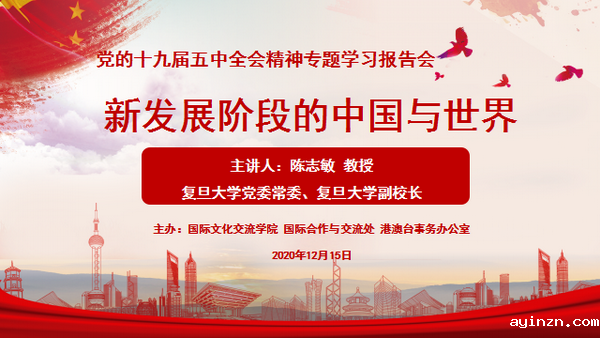 2020年12月15日下午,国际文化交流学院、国际合作与交流处、港澳台事务办公室在光华楼东辅楼503室和501室联合举行十九届五中全会精神专题学习报告会。报告会邀请了复旦大学党的十九届五中全会精神专家宣讲团成员、复旦大学党委常委、副校长陈志敏教授作了“新发展阶段的中国与世界”的专题报告。三部门150余名师生参加了本次学习活动。报告会由国际文化交流学院党委书记王颖主持。